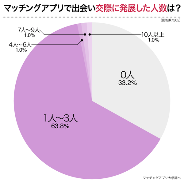次にマッチングアプリで出会った人と付き合った人数についてアンケートしたところ、「1人〜3人」が63.8%ともっとも多く、66.8%の男女が1人以上の恋人をつくることができたという結果でした。約7割ですから、かなり高い確率でカップルが成立しているといえるのではないでしょうか。