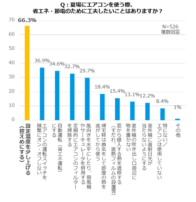 一方で「定期的にエアコンのフィルターを掃除する(32.7%)」、「室外機の吹き出し口周辺に物を置かない(13.1%)」など、その他の工夫ポイントについては1~3割程度の実施にとどまっており、まだまだ工夫の余地は大きいと言えそうです。これからこうした節電術が多くの人に取り入れられることで、無理のない省エネ・節電習慣になっていくことが期待されます。