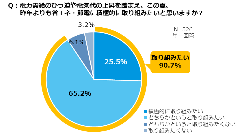 「この夏、昨年よりも省エネ・節電に取り組みたい」と回答した人は約9割(90.7%)と、大多数の人が省エネ・節電に積極的であることがわかりました。電力需給のひっ迫や、電気代の値上がりを背景に、この夏に向け、省エネ・節電に対する人々の意識は大きく高まっているようです。