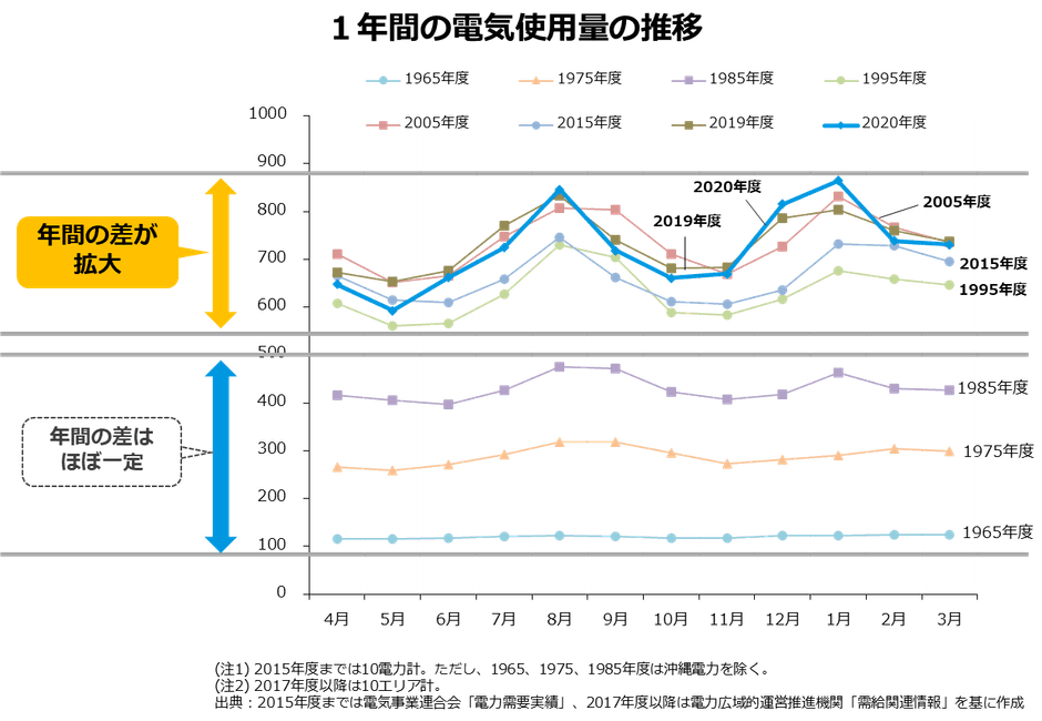 資源エネルギー庁の調査によると、夏の日中(14時ごろ)の一般家庭における電力消費は、照明や冷蔵庫を抑え、エアコンが最大(58%)で約6割を占めていると言われています。さらに、以前は、電気使用量は年間を通じてほぼ一定だったのが、近年、季節によってその差が拡大しています。夏と冬に電気使用量のピークを迎えていることから、季節によって使用頻度が大きく変わるエアコンも、夏場の電力需給に与える影響は大きいと考えられます。