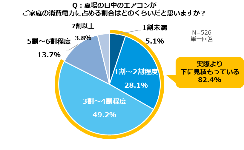 消費電力が大きいと感じる家電1位は「エアコン(74.7%)」 夏場の消費電力の約6割をエアコンが占めているが、 約8割の人はエアコンの消費電力を少なく見積もっている