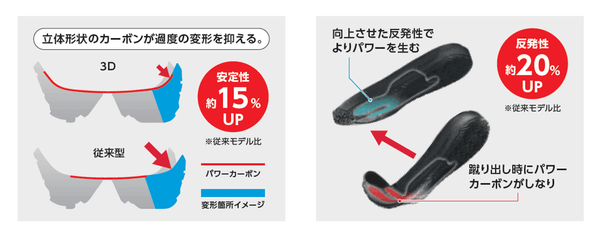 従来のパワーカーボンドライブに対し、積層したカーボンを熱成型することで中足部は3D形状にし、切り返し時のねじれを抑え、前足部は反発性能を向上させた新設計。