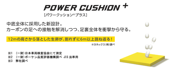 衝撃吸収性と反発性を併せ持つ「軽く、疲れにくい」衝撃吸収反発素材パワークッション。パワークッションに反発性の高い特殊樹脂を添加し、+型の溝を最適な間隔と深さで格子状に配置した新構造を採用した「パワークッションプラス」は、従来の軽量性を保ちつつ、衝撃吸収性を28%※2、反発性を62%※3アップさせ(一般的な衝撃吸収材[EVA]との比較)、12mの高さから落とした生卵が、割れずに6m以上跳ね返る新衝撃吸収反発素材です。