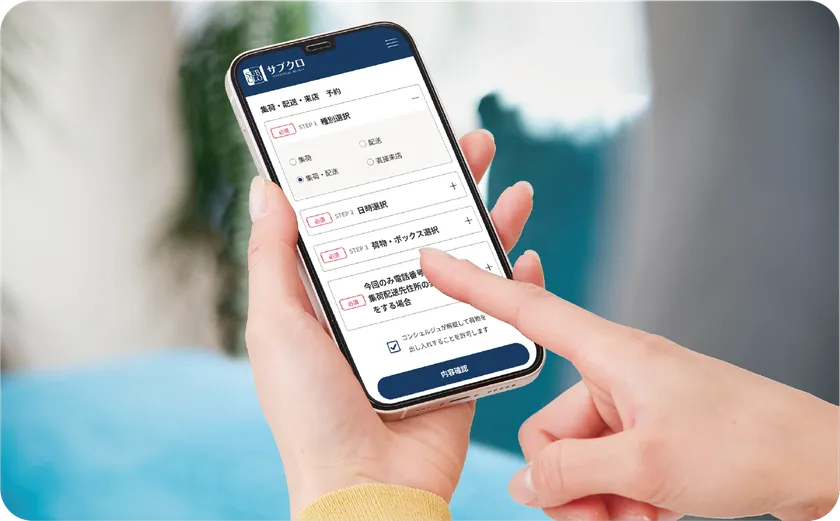 スマホで引き取りと配送予約をするだけで、サブクロ コンシェルジュがご自宅までお伺いし、お荷物の引き取り・配送・収納等すべてをサポートいたします。