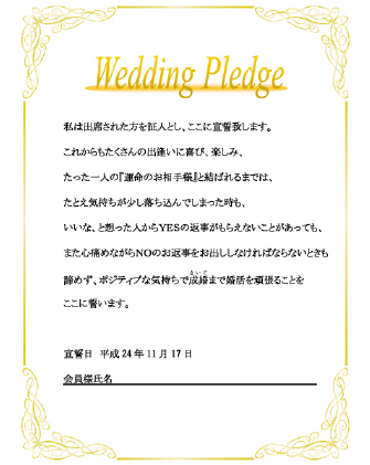 『誓い』は結婚だけでなく、婚活も!?パイプオルガンや聖歌隊も揃っている挙式当日さながらの雰囲気の中、ご成婚後に迎える結婚式本番を想い描きながら、最良の方との成婚とより良い活動をする誓いをしていただきます。当日は抽選で新郎役・新婦役・母親役・父親役などを決定。会員それぞれに役割を持っていただくことで特別な想いを実感していただきます。新郎新婦役の会員には実際にバージンロードを歩いていただくので、もしかしたら本当の恋に発展するかもしれません。サンマリエバージョンにアレンジされた模擬挙式は、新しいブームを巻き起こしそうです。