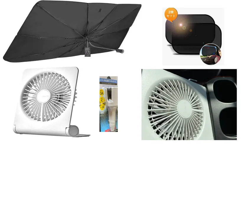 フロントガラス用四角傘、横窓用サンシェード、 USB電源バッテリ付強力ファン、シガレットUSBコネクターの4点セット