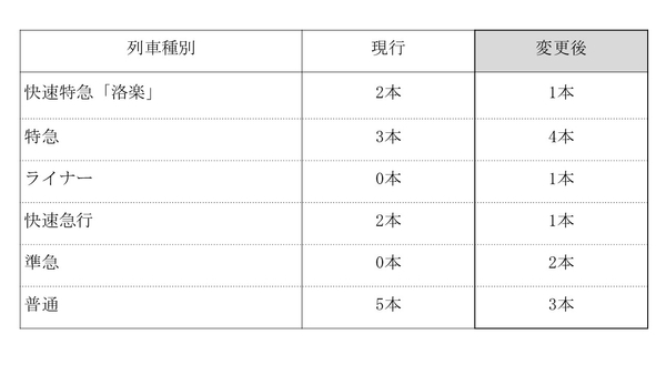 1.全車両座席指定「ライナー」の増発と停車駅の変更を行います