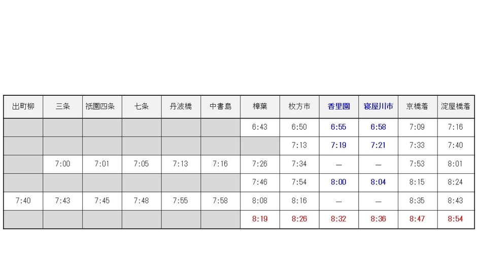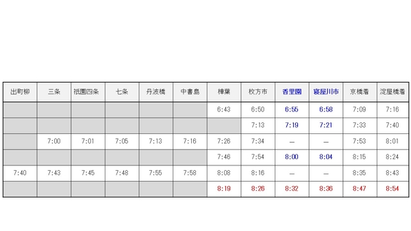 ・朝の樟葉および枚方市発、淀屋橋行が香里園、寝屋川市にも停車します。