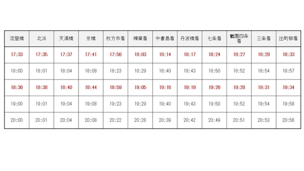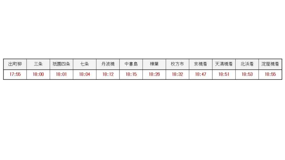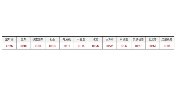出町柳23時39分発、枚方市行「特急」を出町柳23時37分発、淀行「急行」に変更(淀で最終列車の「普通」寝屋川市行に接続します)