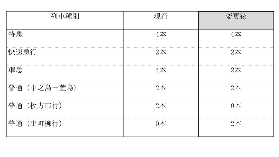 ・13~14時台の中之島-枚方市間「普通」を出町柳まで延長します。これにより、「準急」出町柳行は1時間あたり4本から2本に変更します。