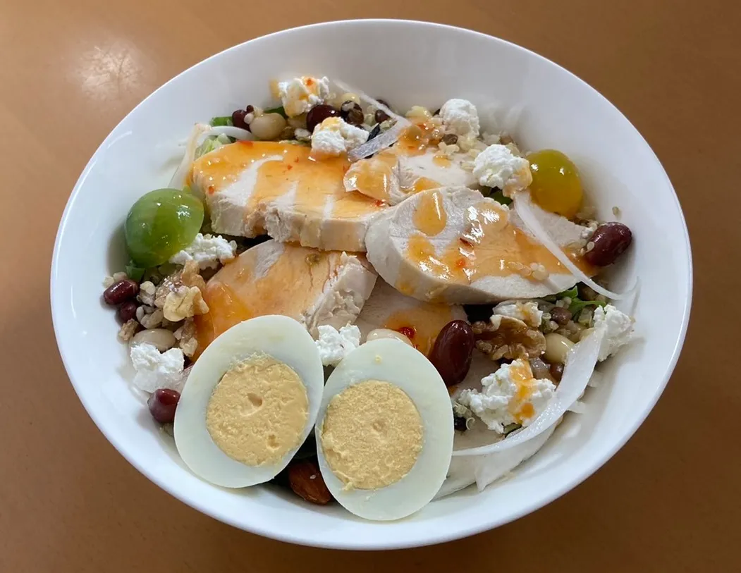 国産鶏胸肉の蒸し焼き、豆(枝豆、大豆、白インゲン豆、金時豆、ヒヨコ豆)、カッテージチーズ、生オニオンやミニトマト、ミックスナッツなど、17品目。鶏肉やチーズの動物性たんぱく質、豆の植物性たんぱく質が一緒に摂れる、体づくりにおすすめのサラダです。【販売期間:通年販売】