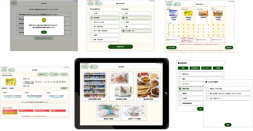 複数商品を比較し多種多様な症状に対する効能効果が確認できる機能や、OTC医薬品の適正販売と適正使用が担保できるしくみを盛り込んでおり、ドラッグストア等のヘルスケア販売事業者がカウンセリング業務のDX(デジタルトランスフォーメーション)を推進し販売促進と適正販売の両立を可能とするツールとなります。