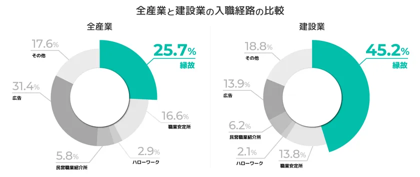 厚生労働省が発表している雇用動向調査によると、建設業で最も多かった入職経路は【縁故】で、全体の【45.2%】であることがわかりました。全産業の、縁故での入職経路が全体の25.7%であることから、建設業においては、圧倒的に人づて・紹介などからの入職が多いということが見て取れます。