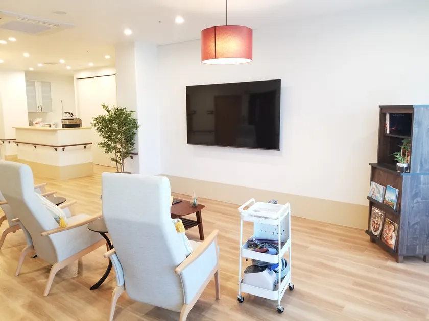 館内はご自宅で過ごすときのように自分らしくリラックスして滞在を楽しんでほしいとの想いを込めて、 “和モダン”スタイルの落ち着いた空間に仕上げています。また、自由にお寛ぎいただけるよう、1階のデイサービスフロアではフリードリンクスペースを設けています。2階のショートステイフロアはユニット(生活単位)ごとに壁面を曙色と浅葱色で朝焼けを表現し、アートパネルなどを用いた寛ぎ空間に仕上げています。各個室も落ち着きあるトーンで揃え、YouTubeやブルーレイなどお楽しみいただける環境を整えています。地元に根差したセンターとして在宅生活を自分らしく楽しむためのサポートをいたします。