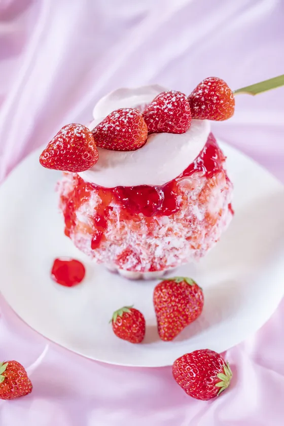 かき氷といちご串の組み合わせで、夏祭り気分を味わえる一品。インパクト大なビジュアルで、見た目だけでなく、削りいちごを使用した氷やいちごジュレで中身でもたっぷりいちご感をお楽しみいただけます。