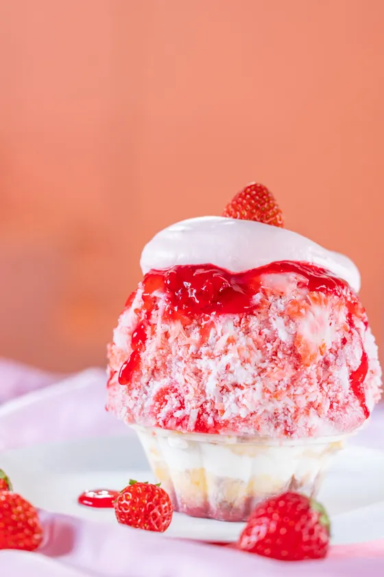カップタイプでお持ち歩きにもオススメの「けずりいちごおり」。底にはいちごゼリーが入っているので、食感の違いと爽やかさで最後まで飽きずに、いちごの美味しさをお楽しみいただけます。