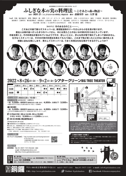 劇団銅鑼創立50周年記念公演第2弾No.57『ふしぎな木の実の料理法~こそあどの森の物語~』が2022年8月26日 (金) ~2022年9月2日 (金)にシアターグリーン BIG TREE THEATER(東京都豊島区)にて上演されます。