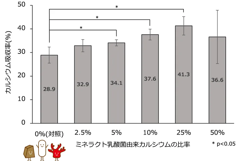 ミネラクト乳酸菌を配合した試験溶液では、対照の試験溶液に比べて、ラットの十二指腸におけるカルシウム吸収率が高いという結果が得られました(図)。
