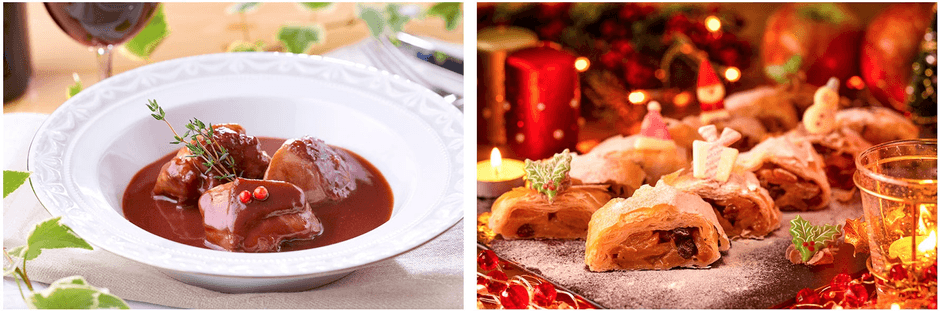 右:林檎とレーズンのキャラメリゼをパートフィロに包みサクサクに焼き上げた冬ならではのデザート。そのままはもちろん、バニラアイスを添えて召し上がるのもお薦めです。バイキングならではのご自分だけの一皿を作ってみませんか?