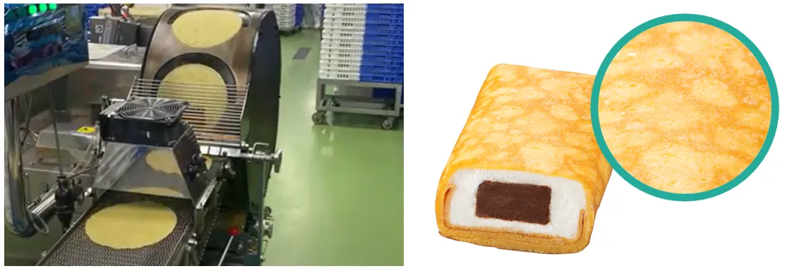 クレープの生地といえば、適度な焼き色が付いたキリン柄が特徴です。「ファミマ・ザ・クレープ」では、そのキリン柄の美しさにもこだわり、オリジナルのクレープ粉の配分や、生地を焼く際の温度の微調整を重ねました。水車式の機械を使用して焼き上げます。