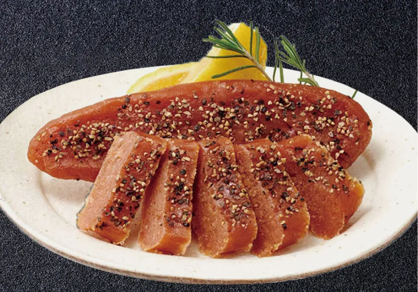 やまやの熟成辛子明太子を丹精に乾燥させ、からすみ風に仕上げました。明太子の旨みそのまま、ぎゅっと濃縮した味わいと、ブラックペッパーの刺激的で爽やかな風味をお楽しみいただけます。ドライ明太子ならではのもっちりとした食感と濃厚な味わいが特徴です。