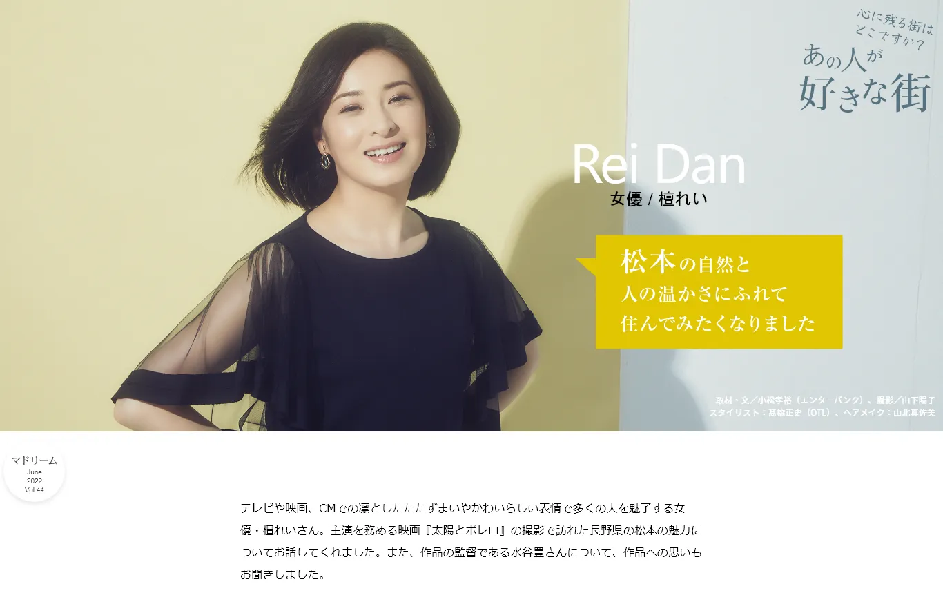 映画やドラマ、舞台に出演する「あの人」が、好きな街を語ります。今回登場するのは、女優の檀れいさん。凛としながらも愛らしい佇まいで多くの人を魅了し続けている檀さんが好きな街は、公開中の映画『太陽とボレロ』のロケで訪れた長野県の松本市。「いつか住んでみたい」と語る、檀さんの松本への思い、公開中の映画についてもたっぷりとお話を聞いています。