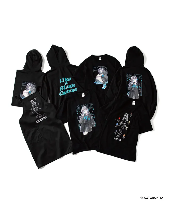 まどかとのリンクコーデを楽しめるフルジップパーカー、コラボビジュアルを大胆に使用したパーカー、プラモデルの組立説明図をサンプリングしたTシャツやエプロンなど、プラモデルコンテンツである創彩少女庭園ならではのデザイン、アイテムがラインナップ。