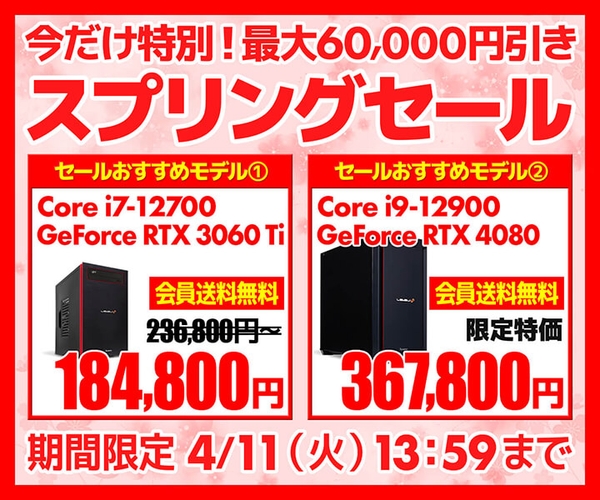 ※セール対象BTOパソコンは4/11(火)13:59まで、セール対象パーツ・周辺機器&セール対象中古商品は4/25(火)13:59までとなります。