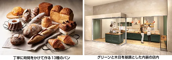 店舗名の「アンダンテ」とは、音楽用語で「歩くような速さで」という意味で、人やモノが行き交う街「梅田」の中心地にありながら、グリーンと木目を基調とした内装の店内では、ゆったりとした時間が流れ、ショーケースに並べられたパンをスタッフが対面式でお取りします。“アンダンテ”のテンポのように、お客様一人ひとりの“歩調に合わせて”提供します。