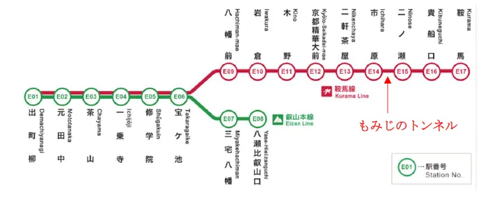 鞍馬線 市原駅~二ノ瀬駅間にある「もみじのトンネル」区間(約250m)