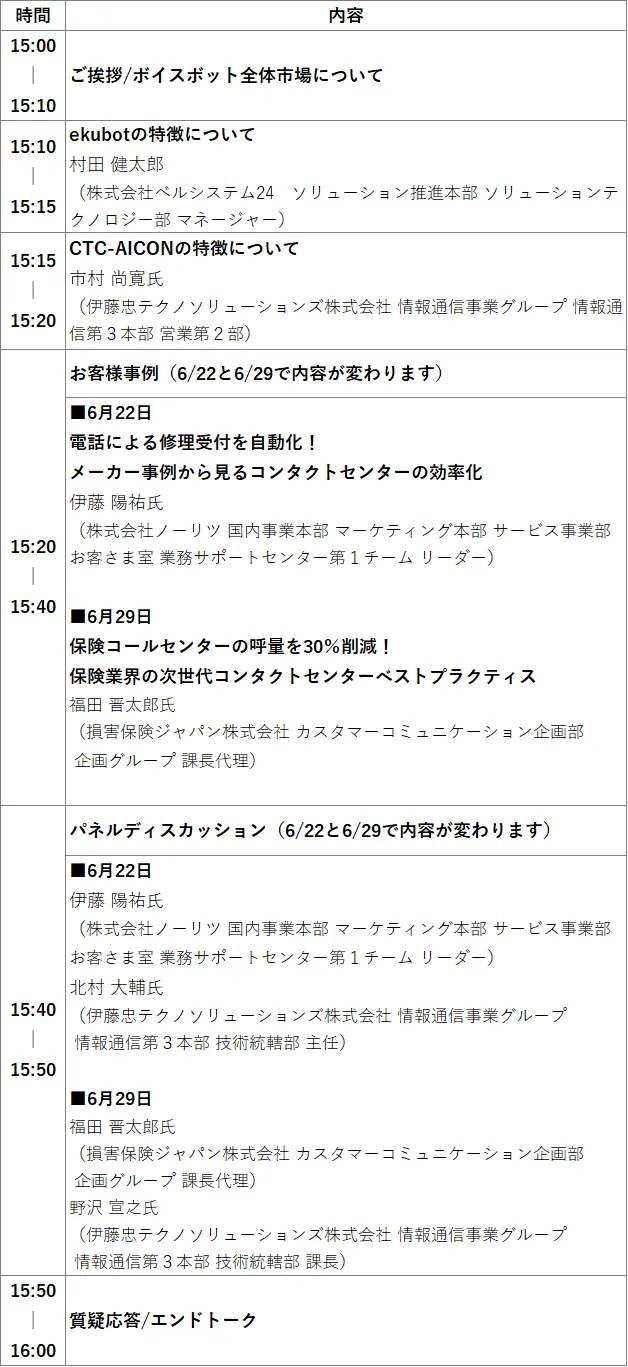 当社からは、ソリューション推進本部 ソリューションテクノロジー部の村田 健太郎より、ボイスボット市場全体の最新トレンドに加え、当社が提供するボイスボット『Voice LITE』『Voice PRO』の機能紹介や導入事例について解説、CTCからは、情報通信第3本部 営業第2部 市村 尚寛氏が、AIを使用したコンタクトセンター向け自動音声対応ソリューション「CTC-AICON」についてご紹介します。また、導入企業として、22日に株式会社ノーリツ様、29日に損害保険ジャパン株式会社様にご登壇頂き、導入以前の課題と導入後の効果などについご説明いただいた後、パネルディスカッションを行い、ボイスボット導入に至るまでの苦労などをお話しいただきます。