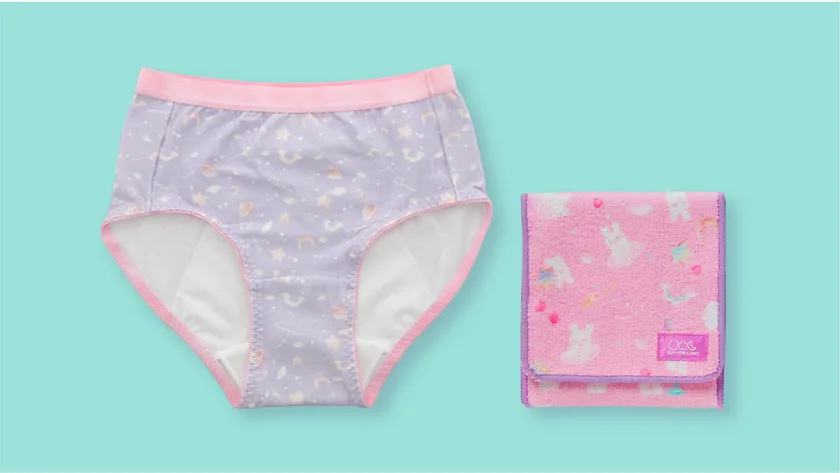生理中に身につける「サニタリーショーツ」と、生理用ナプキンを入れる「ハンカチ型ケース」は、どちらもサンスタールナオリジナルのデザインです。ブルーな日にも気持ちが安らぐような、心ときめくキュートなデザインに仕上げました。「ハンカチ型ケース」はお子さまが楽しみながら選べるように、デザインを4種類ご用意しました。