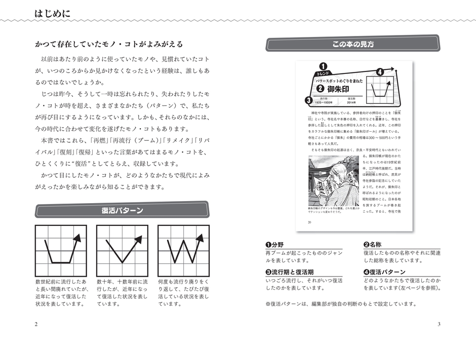 世の中には絶滅するものがあれば、一方で復活するものもある――。好評を博した『絶滅事典』に続く第二弾は『復活事典』!! 過去に絶頂期を迎え、隆盛を誇った娯楽、スポーツ、ファッション、建物など、ひょんなきっかけで21世紀に再燃、再生、再建したさまざまジャンルの再沸騰モノ&コトを一挙に紹介する。