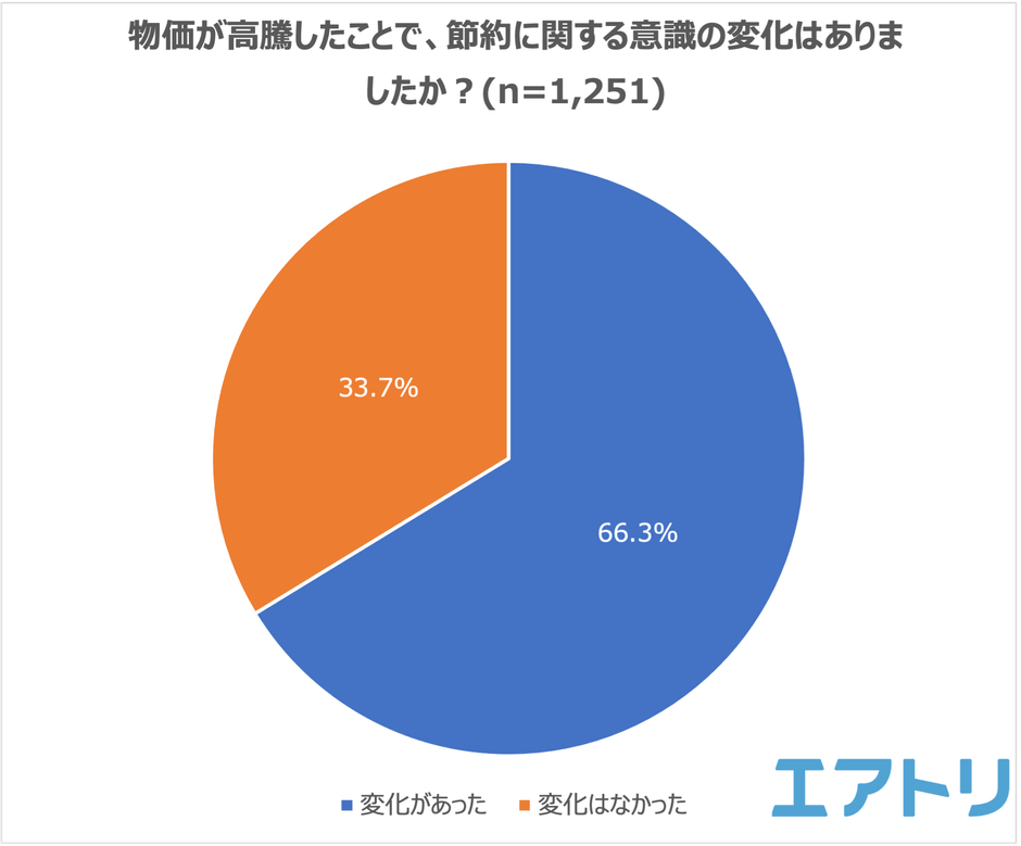 物価高騰によって節約意識に「変化があった」人は66.3%となった一方で、「変化はなかった」と回答した人は33.7%でした。