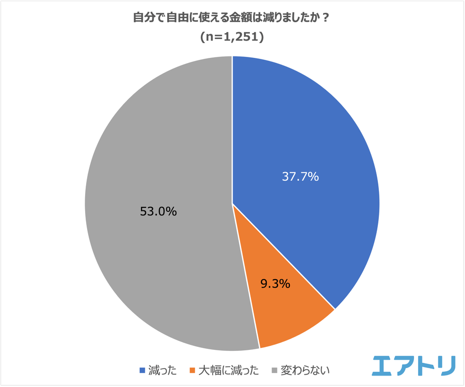 物価高騰を実感している人が多い中でも「変わらない」人は53%でした。一方で、自分で自由に使える金額に「変化があった(37.7%)」、「大幅に変化があった(9.3%)」人は合わせて47%でした。