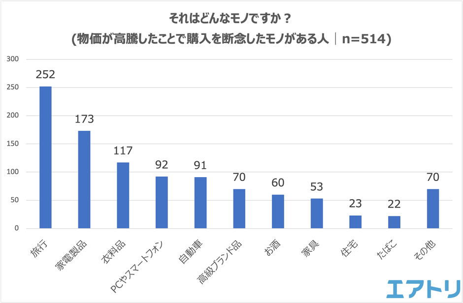 物価が高騰したことで断念したモノのうち、1位は「旅行(252票)」となりました。2位が「家電製品(173票)」、3位が「衣料品(117票)」でした。
