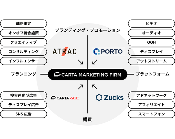 広告代理事業を展開するCARTA AGEとATRAC、国内最大級のスマートフォンアドネットワークであるZucks、ブランド広告主向けアドプラットフォームであるPORTOの4社が統合することで、組織体制の強化を図ります。