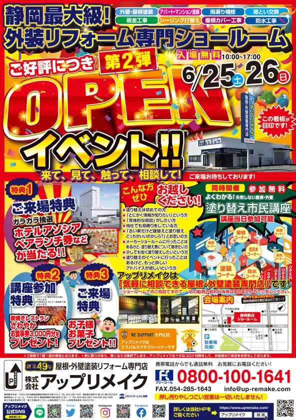 屋根塗装・外壁塗装や防水工事を見て触って体験できる 静岡最大級のアップリメイク静岡葵店ショールーム OPENイベント第2弾を6月25日(土)と26日(日)に開催