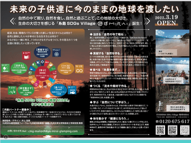 「ITOSHIMA SDGs Village 地球MIRAI」は福岡県糸島市二丈にある、株式会社トキメクデザインが運営する2022年3月にオープンした「今のままの地球を そのまま未来の子供達に渡したい」を理念とした全国初のアウトドア複合施設。今の暮らしをSDGs視点で原点から見直し、これからの暮らし方、働き方、地域・自然との関わり方を提案していく活動を推進しています。