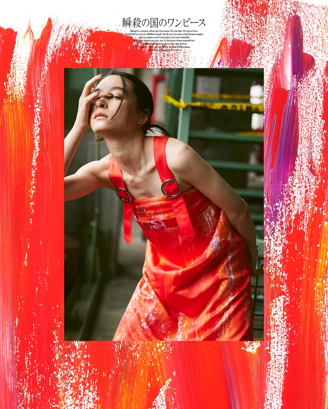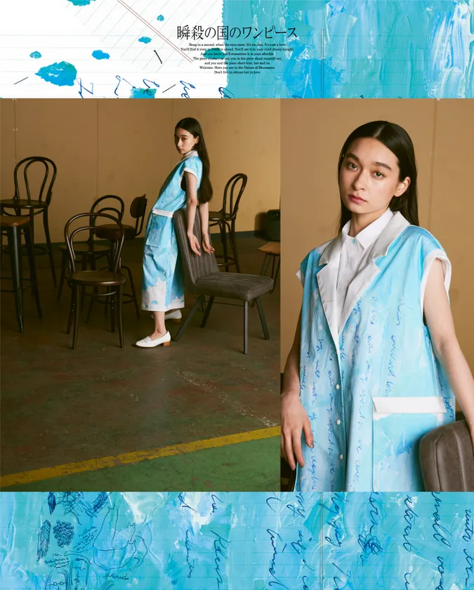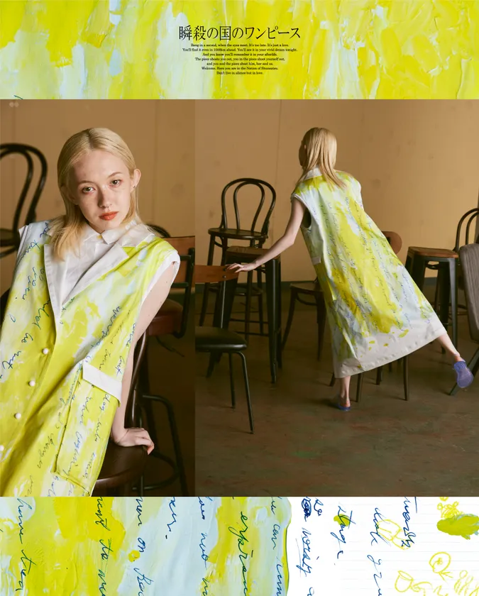 『瞬殺の国のワンピース』は、気鋭の映画監督/アーティストのイリエナナコと数々の映像制作を手掛けるクリエーター・ナガヤマシゲキがタッグを組んで生み出すワンピース専門ブランド。“着る人の心も見る人の心も、一瞬で打ち抜くワンピース”をテーマに掲げる。またデザインひとつひとつに、ユニークなタイトルがつけられ、短い物語が添えられています。