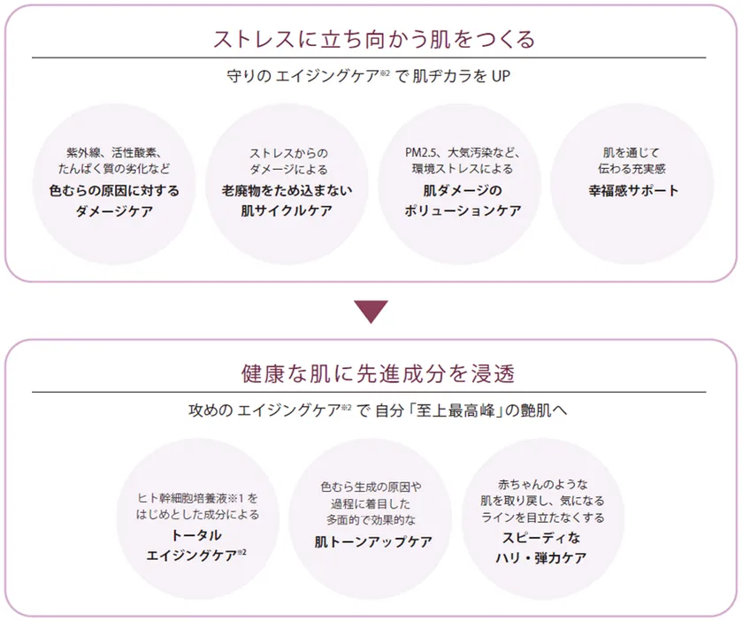 攻めのエイジングケア※2 を叶えるためには、日々ストレスに晒されている肌を健康な状態に底上げすることが不可欠です。そこで、肌あれなどのダメージケア、環境ストレスケア、肌記憶ダメージに着目したケアを「守りのエイジングケア※2」とし、「攻め」と「守り」をバランスよく設計することで、今までにないパワフルで充実感に満ちた肌へ導きます。