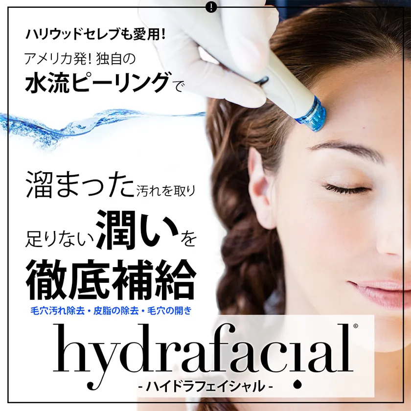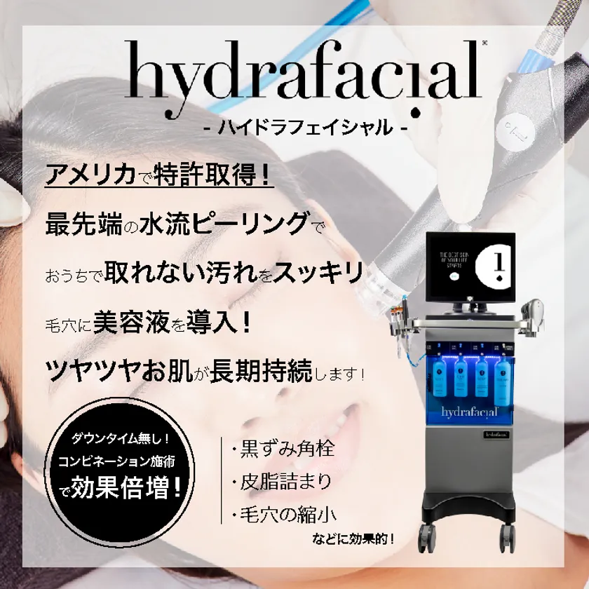 美容成分を含んだ水流を起こし、痛みなく古い角質や皮脂を取り除き、同時に美容成分を導入していきます。すべての肌質に対応しており、1度施術すると効果は2週間程度持続するため、定期的な来院をおすすめしています。