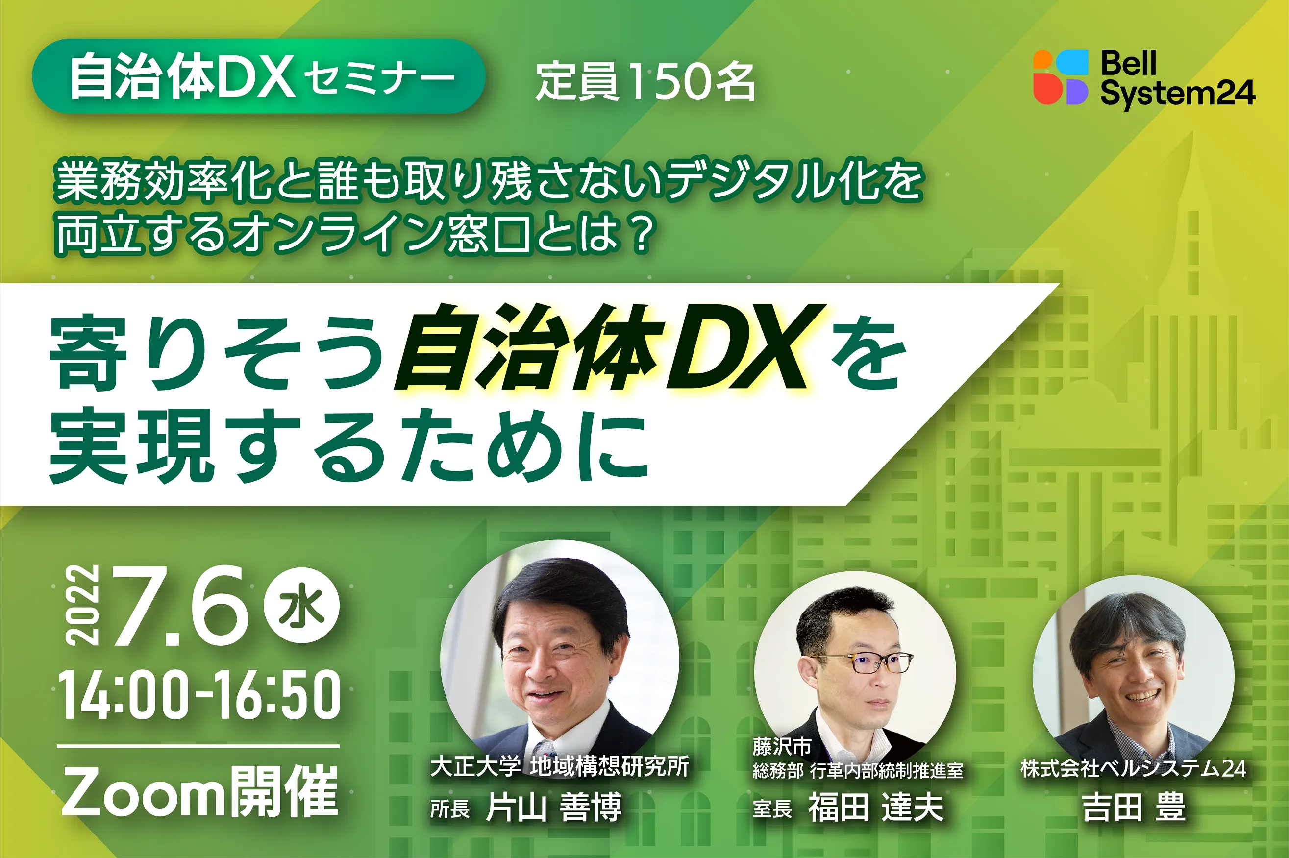 株式会社ベルシステム24(本社:東京都港区、代表取締役 社長執行役員:野田 俊介、以下:当社)は、2022年7月6日(水)、「業務効率化と誰も取り残さないデジタル化を両立するオンライン窓口とは?~寄りそう自治体DXを実現するために~(以下、本セミナー)」と題した自治体向けのオンラインセミナーを開催します。