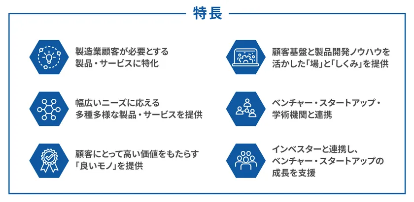 スタートアップ・ベンチャー企業との取り組みだけでなく、ベンチャーキャピタルなどの投資家と連携し、製造業向けビジネスに取り組んでいる出資先企業に対して販売・技術面に加えて、資本面でも支援します。また、M&A事業者などと連携した資本提携にも取り組みます。