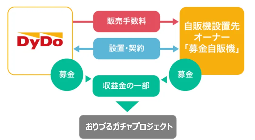 ダイドードリンコ株式会社が展開する『募金自販機』を活用し、持続可能な障害者の就労支援を行うための活動資金として、収益の一部を『おりづるガチャプロジェクト』の活動資金にあてられます。