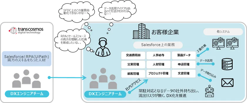 トランスコスモス・デジタル・テクノロジーは、このような顧客企業のDX内製化推進の支援サービスとしてSalesforceとRPA(UiPath)の両方のスキルを要したDXエンジニアをお客様企業へ常駐させることで、セールスフォース・ジャパンのプラットフォームを導入されているお客様のDX推進、及び人材育成を通したDX内製化をご支援できるサービスの提供を開始いたしました。