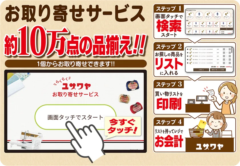 検索機端末はユザワヤ全店に設置してあり、いつでも自由に使えます。操作はとても簡単!お探しの商品を検索して、買い物リストに入れ、リストを印刷したら、レジにお持ちいただきお会計をするだけ。商品が届いたら、お店からお知らせします。お近くのスタッフに声をかけていただいても詳しくご案内します。商品番号等がわからなくてもお調べするので安心です。