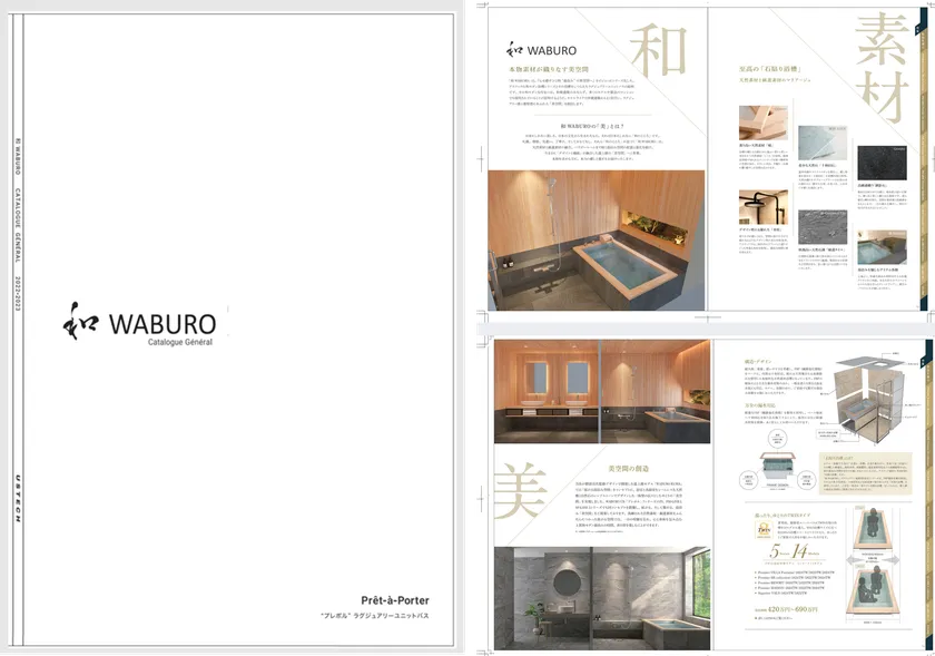 「和モダン石貼り浴槽」標準で、200万円から、300万・400万・500万と、Just Priceモデルの規格型ユニットバスの「プレポル7」ラインナップの完成に合わせ、全UB商品を網羅した「和 WABURO」プレポル 総合カタログ94ページが完成しました。
