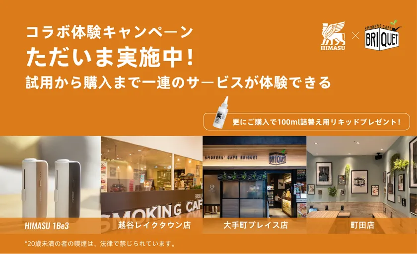 通常の紙タバコを加熱式として吸うことを可能にする新ジャンルのデバイスを展開する「HIMASU(ヒマス)」(楊寧、以下「HIMASU」)は、2022年6月20日より、SMOKERS'CAFE BRIQUETとコラボし、店舗にて商品の体験や購入のキャンペーンを実施しております。お客様は指定店舗にて、HIMASUデバイス1Be3のご試用とご購入ができます。キャンペーン中、商品ご購入のお客様にオリジナル詰替え用リキッド100mlボトル1本をプレゼントいたします。
