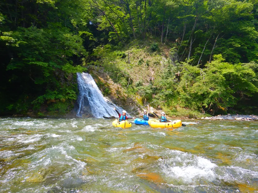 「入門」ツアーをクリアした方対象のダウンリバーツアーです。「入門」ツアーよりも長い距離、激しく難しいセクションにチャレンジできます。途中、岩からの飛び込みや、パックラフトでのサーフィンなどアトラクションも多数あります。特製ランチ付きも大好評です。